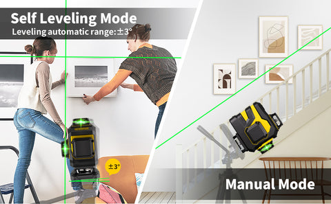 - 🔎【Self / Manual Leveling Mode】Turn on the power to self-leveling mode, the cross line laser will be automatically leveled within 3°, otherwise the cross line laser will send out an alarm with the lasers flashing. Keep the power off, press and hold the brightness button for 3s to turn on/off the manual leveling mode, which can be placed at any angle of use.