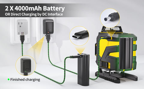 - 🔎【2 x 4000mAh Batteries】 Allow for up to 10 hours of work time with all laser lines turned on, making it possible to complete a whole day's work. The batteries have a Type-C interface and can be charged directly, while the laser level has a DC interface that allows the batteries to be charged while placed inside the laser level.